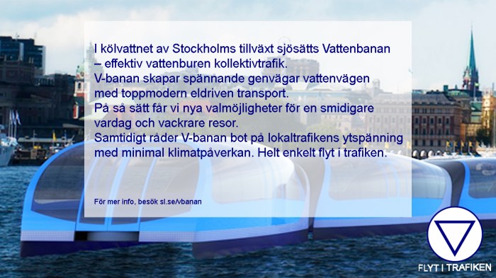Informationstext för Stockholms framtida Vattenbana (vision). Jag skapade också märket för V-banan med syfte att matcha tunnelbanans T-symbol. Den nedåtpekande triangeln är elementsymbolen för vatten.