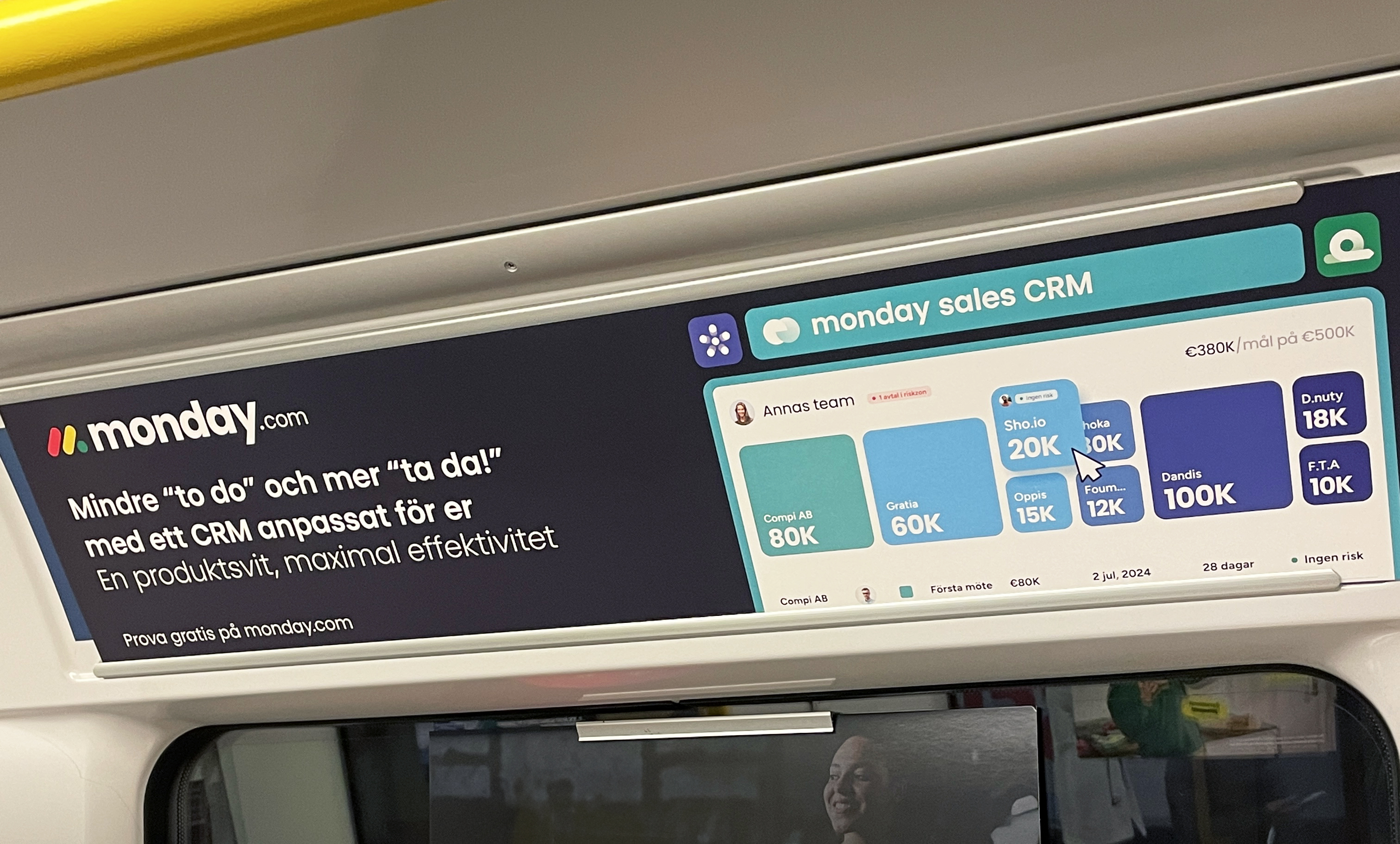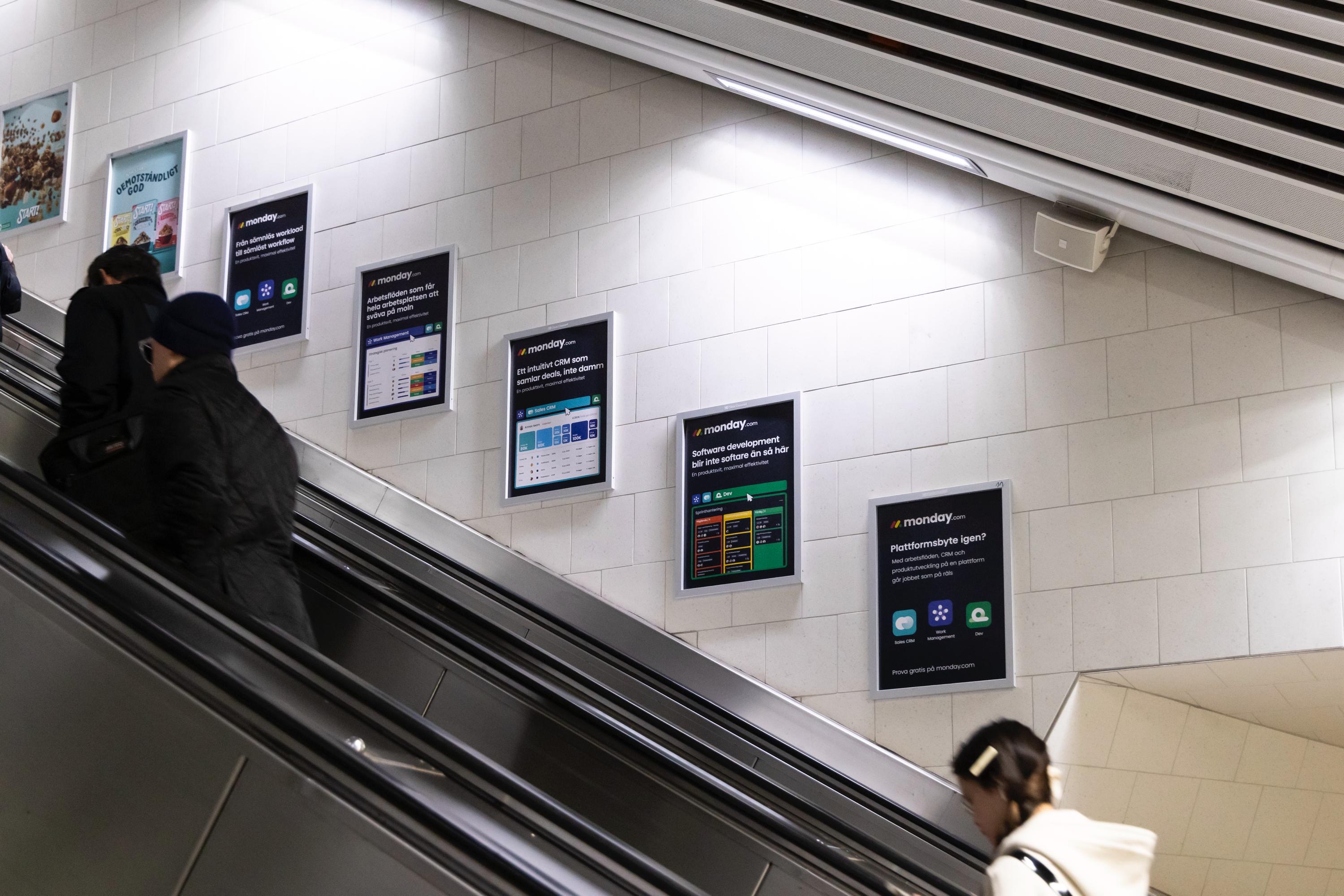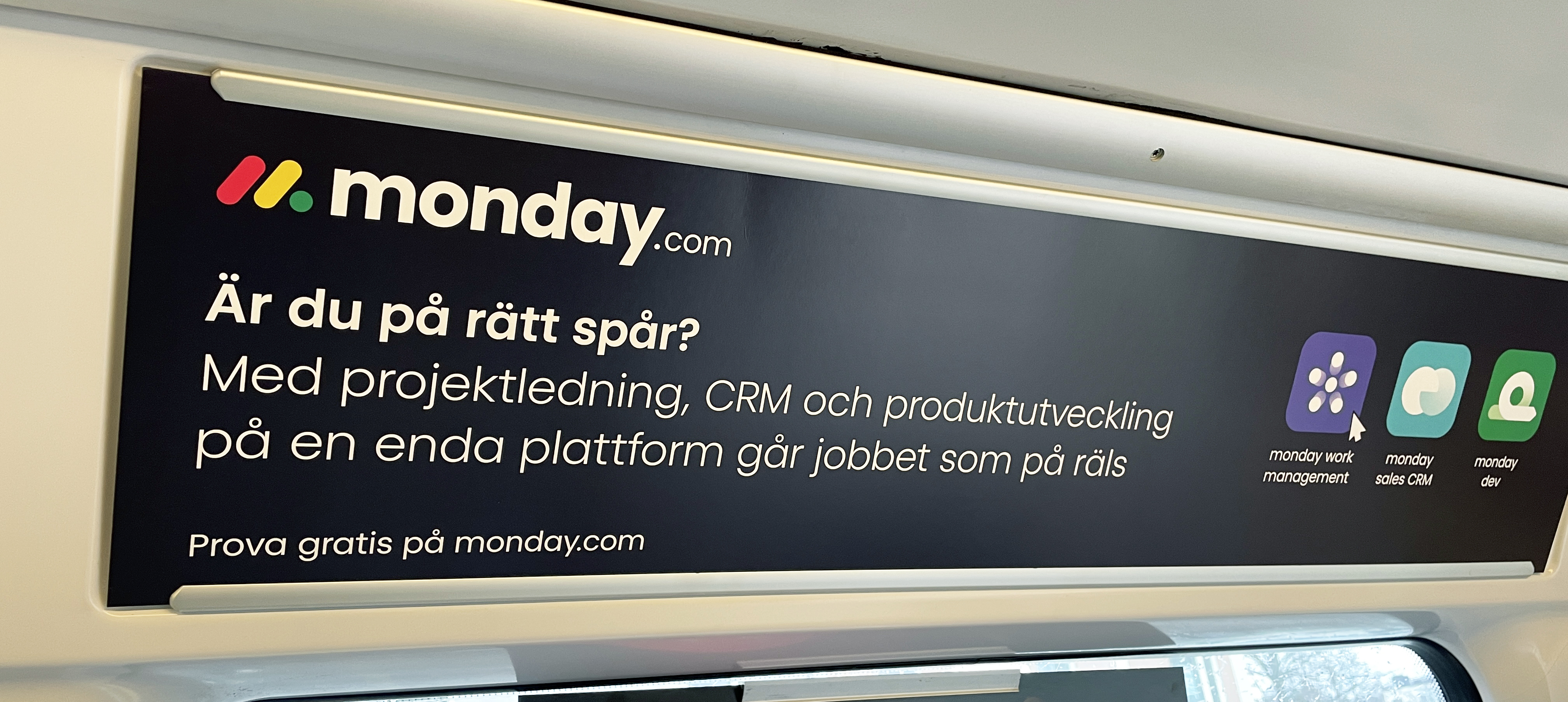 OOH-kampanj i Stockholms lokaltrafik (april, 2024) för monday.com med syftet att introducera deras integrerade produktsvit för CRM, produktutveckling och work management. Totalt ett tiotal olika rubriker, Frilans