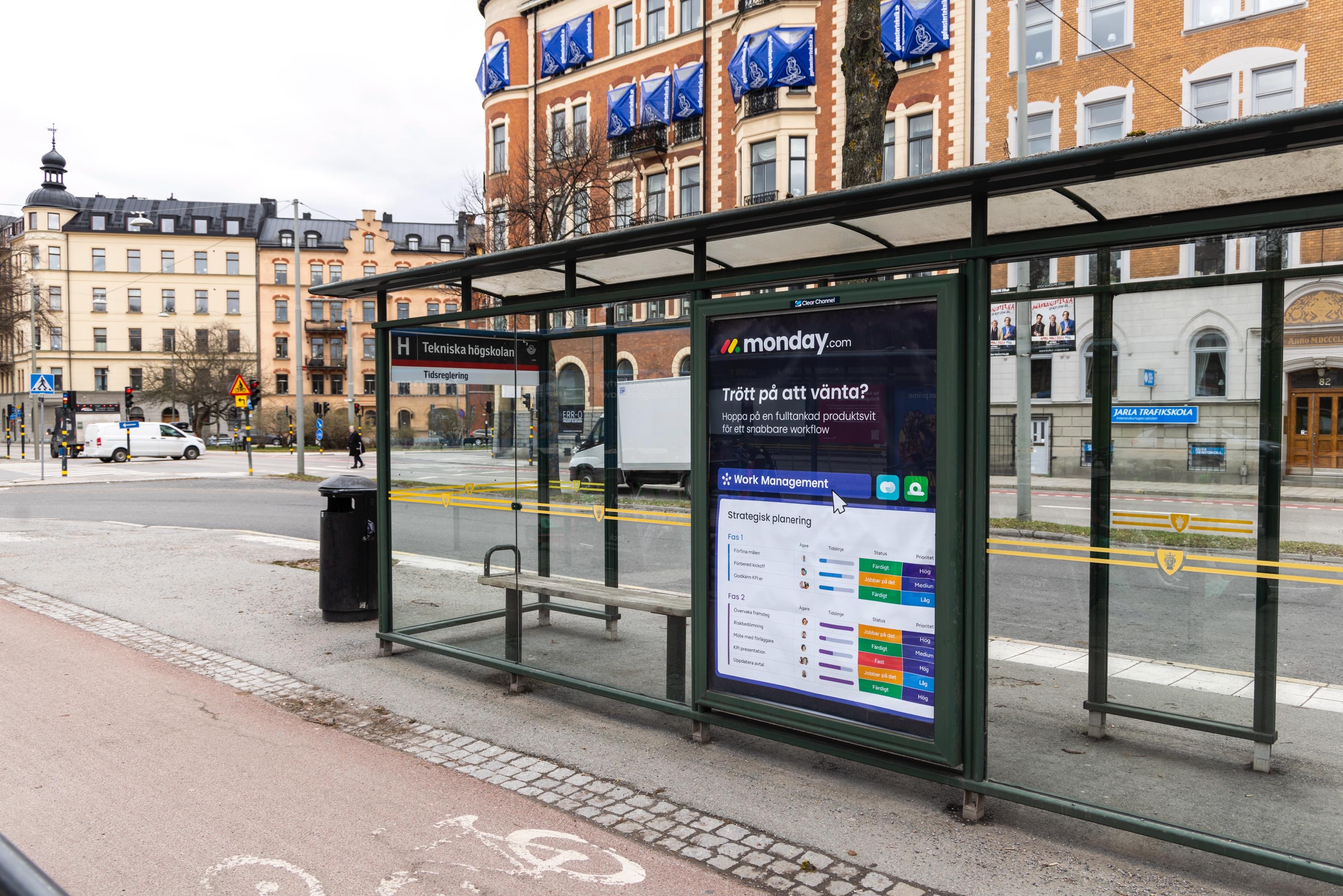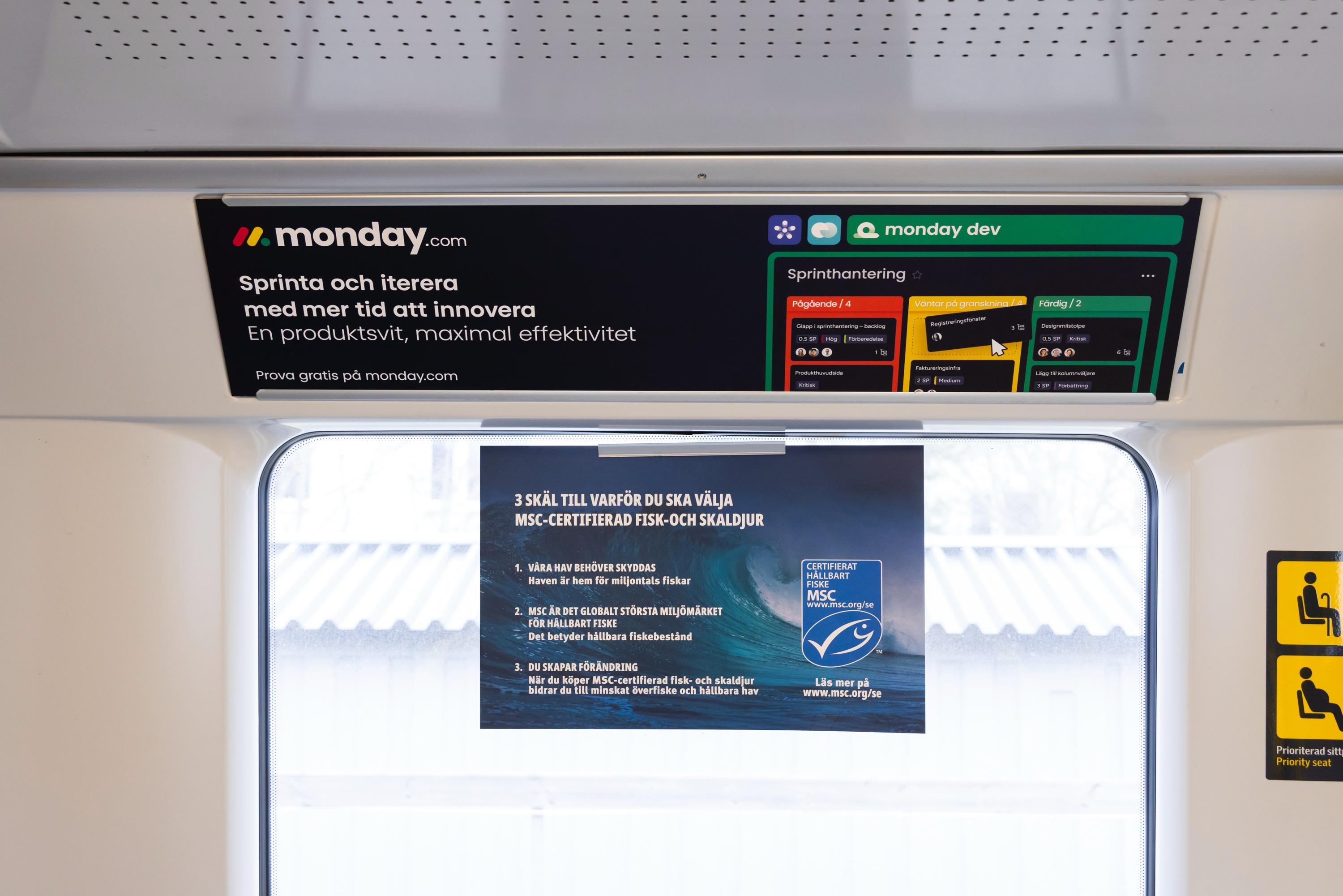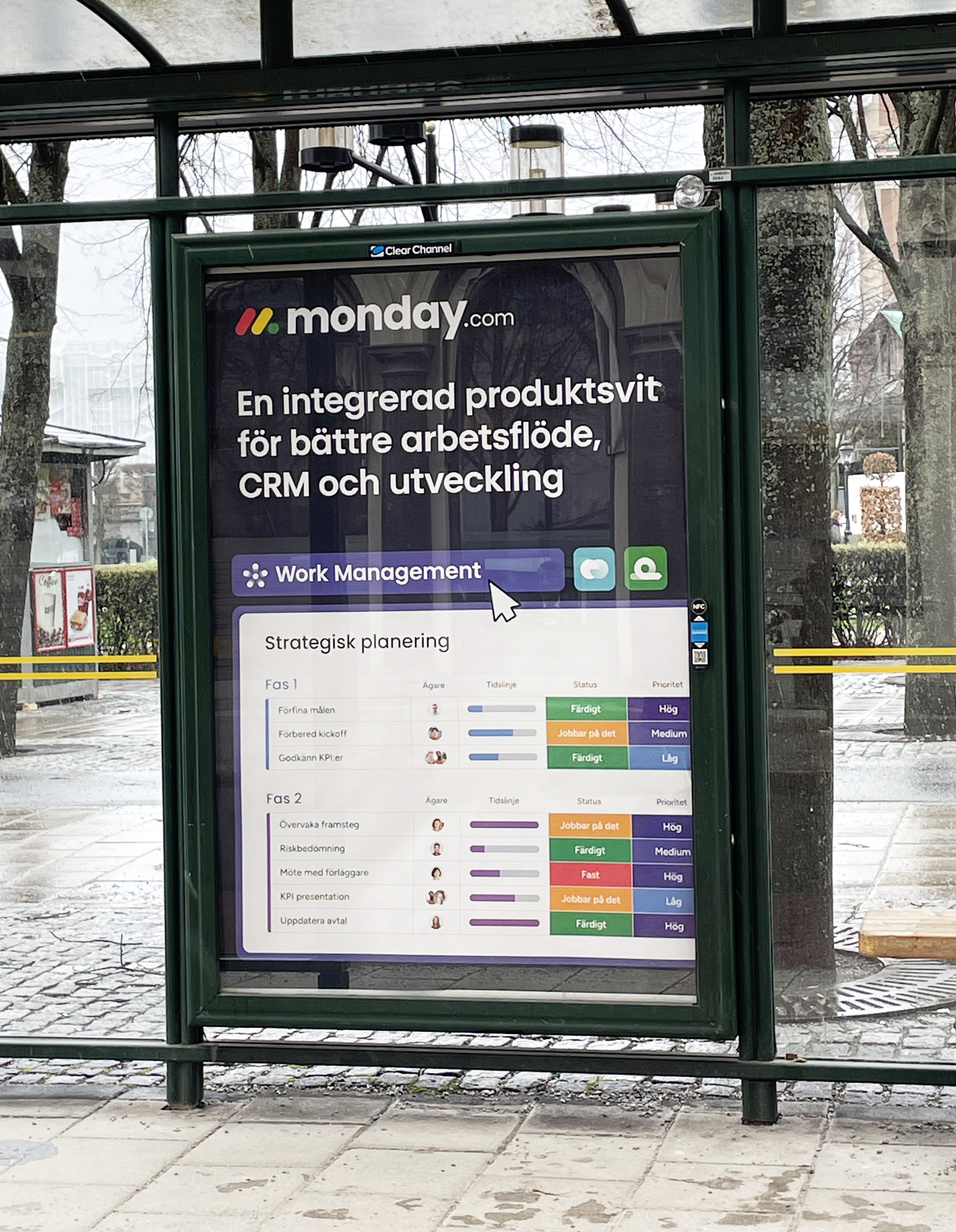 OOH-kampanj i Stockholms lokaltrafik (april, 2024) för monday.com med syftet att introducera deras integrerade produktsvit för CRM, produktutveckling och work management. Totalt ett tiotal olika rubriker, Frilans